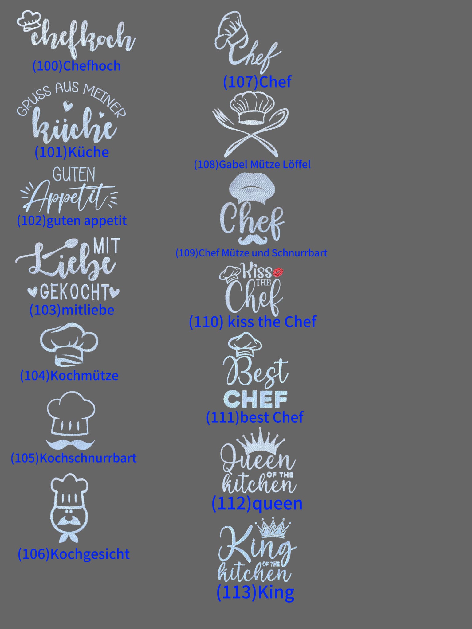– Text (z. B. „Mama Kochkönigin“, „Grillmeister Peter“)