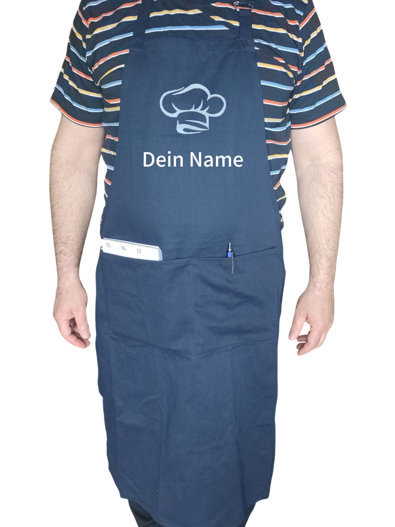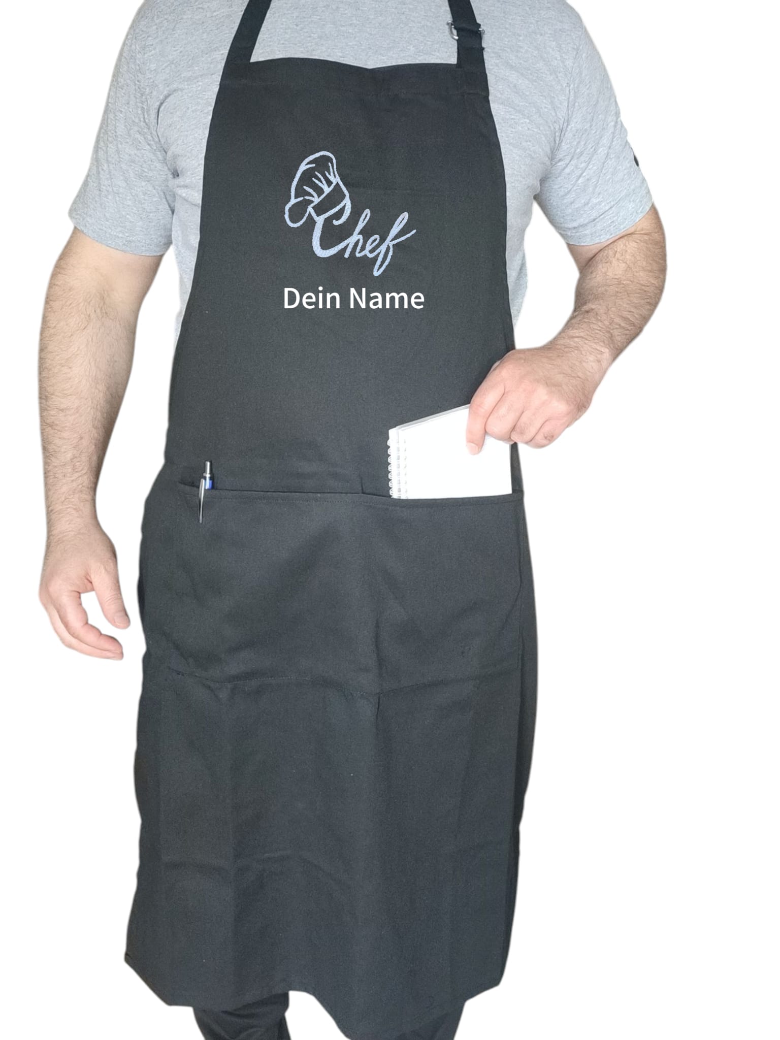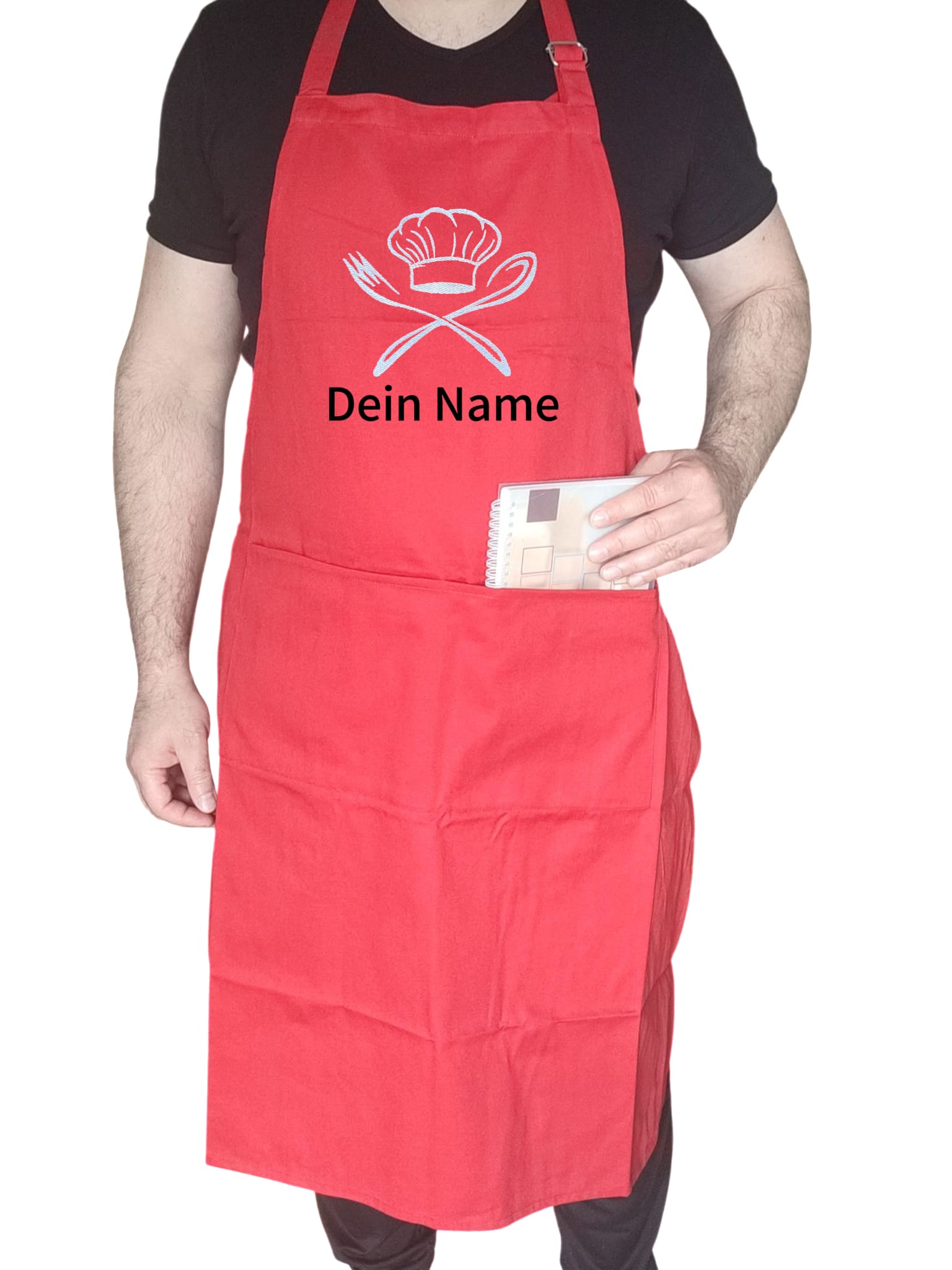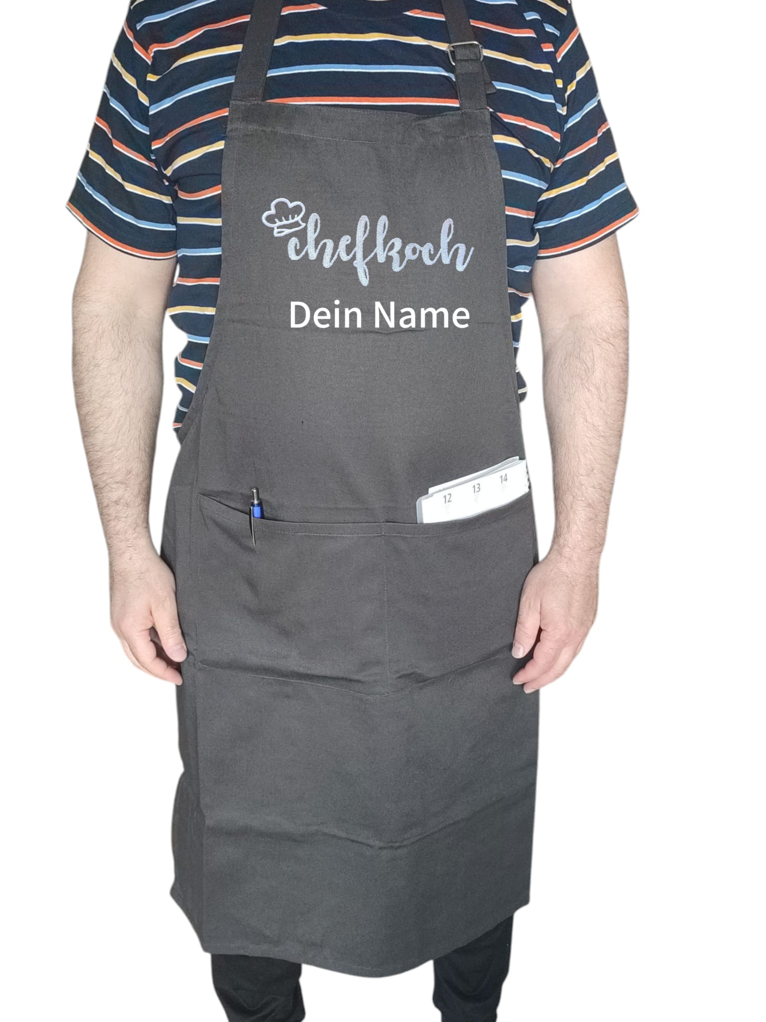 Unsere hochwertige Schürze kann mit einem Namen oder kurzen Text bestickt werden – ideal für Hobbyköche, Omas, Opas, Eltern oder als Geschenk.